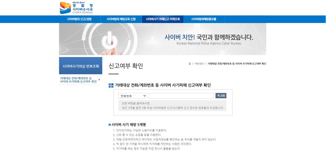 사이버범죄가 급증하는 시점에서 계좌번호나 전화번호, E-mail을 미리 조회하는 것이 조금이라도 피해를 줄이는 방법이다. 사이버수사국 홈페이지와 사이버캅 애플리케이션의 '사이버사기 피해신고 이력 조회' 서비스에서 조회가 가능하다. 사이버 수사국 조회 서비스를 이용하면 사기 번호 조회에서부터 접수된 계좌 피해 번호까지 검색이 가능하며 최근 3개월 동안 3회 이상 피해가 접수된 번호들과 비교해서 사기 계좌 여부를 검색하는 서비스를 제공한다.