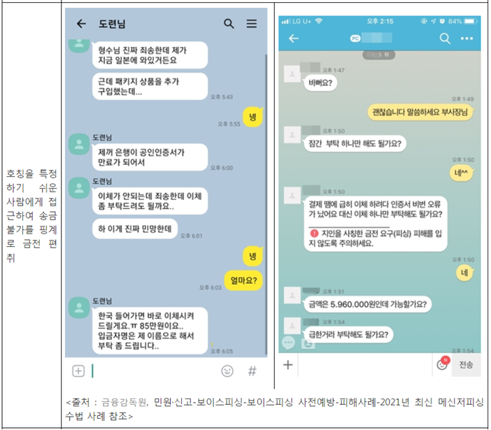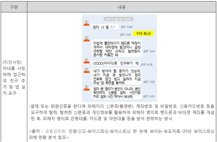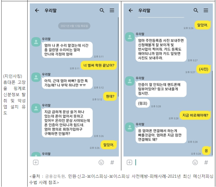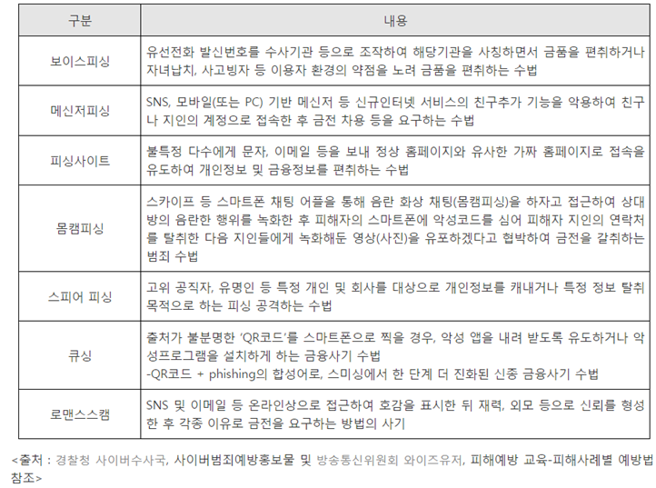 “피싱(Phishing)”이란 ‘개인정보(Private data)를 낚는다(Fishing)’라는 의미의 합성어로, 전화·문자·메신저·가짜사이트 등 전기통신 수단을 이용한 비대면거래를 통해 피해자를 기만·공갈함으로써 이용자의 개인정보나 금융정보를 빼낸 후, 타인의 재산을 갈취하는 사기 수법을 말합니다(금융감독원, 민원·신고-보이스피싱 지킴이-보이스피싱 한눈에-피싱사기 정의 참조). 피싱 사기는 전화뿐만 아니라 문자, 메신저, 인터넷 사이트 등 다양한 전기통신수단을 통해 이루어지고 있습니다.