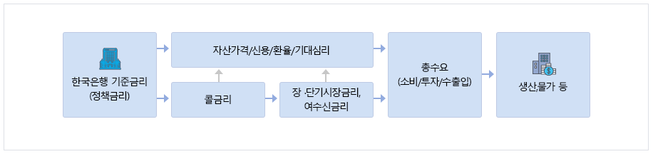 한국은행의 기준금리 변경은 다양한 경로를 통하여 경제 전반에 영향을 미친다. 이러한 파급경로는 길고 복잡하며 경제상황에 따라 변할 수도 있기 때문에 기준금리 변경이 물가에 미치는 영향의 크기나 그 파급시차를 정확하게 측정할 수는 없지만 일반적으로 다음과 같은 경로를 통하여 통화정책의 효과가 파급된다고 할 수 있다.