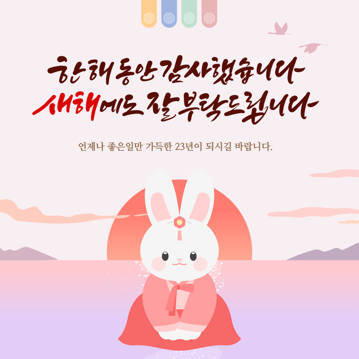 - 지난해 베풀어 주신 은혜와 한결같이 보내주신 성원에 감사합니다. 새해에도 건강하시고 평안하시길 기원하며, 올해도 따뜻한 마음을 나눌 수 있길 바랍니다.