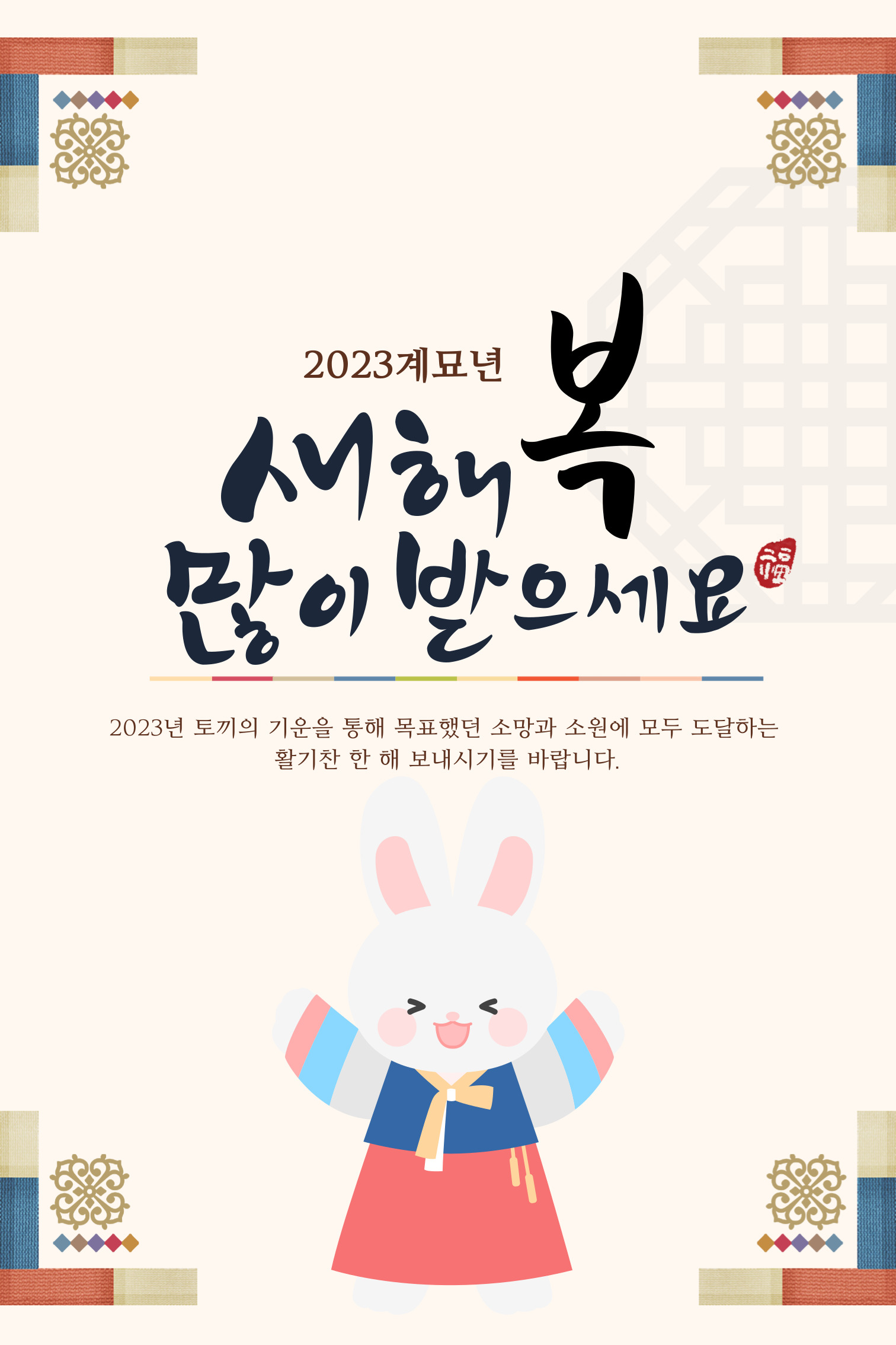 - 2023년 새해를 맞이하여, 소망하시는 모든 이리 이루어지는 한 해가 되길 바랍니다. 모든 뜻하신 일에 만사형통하길 바라며 가정과 일터에 행복이 가득하고 웃음꽃이 만발하는 새해 보내세요